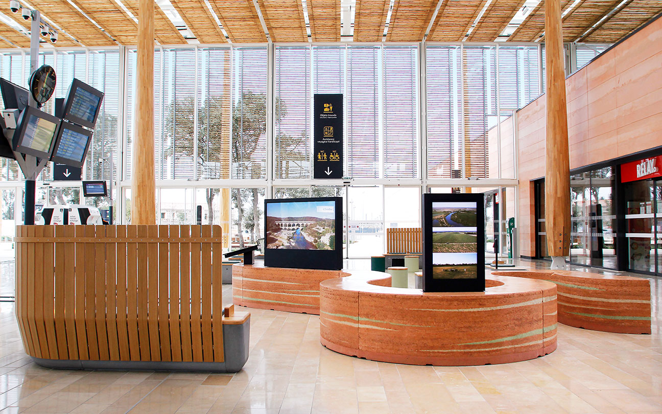 • Entre structure architecturale et fonctionnalité des assises, la démarche sculpturale et artistique de la “Serpentine” complète le registre scénographique de l’espace. Les dispositifs numériques d’affichage dynamique donnent à voir des contenus vidéo “séduction” de la destination. Les dispositifs interactifs renseigneront les voyageurs par des recherches personnalisées. Pour compléter, les personnes en situation de handicap trouveront un dispositif d’orientation et d’information tactile interactif spécifique.