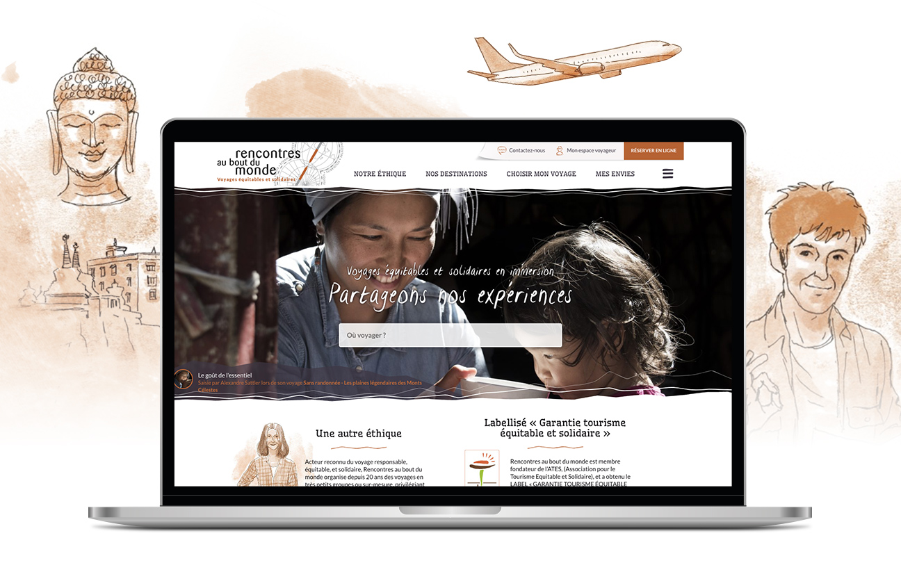 Rencontres au bout du monde a souhaité refondre son site vitrine pour se doter d’un outil professionnel de réservation de voyage. L’objectif était double. D’une part, le site devait permettre de présenter les voyages proposés et aux visiteurs d’effectuer une pré-réservation avec versement d’un acompte, et d’autre part, servir de plateforme pratique pour les voyageurs, à travers des outils facilitant les échanges entre la communauté de voyageurs et faciliter la gestion technique et administrative des voyages (informations, échanges de documents).