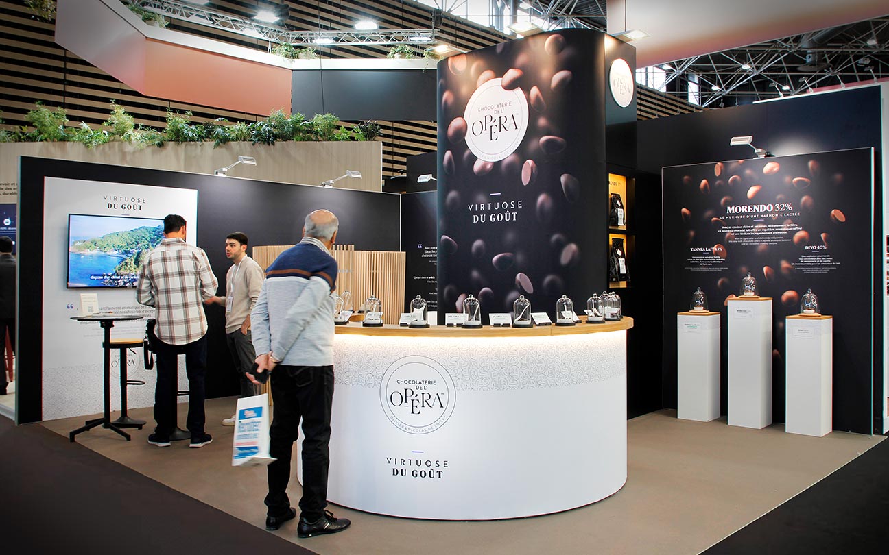 Le stand 2025 a mis en lumière la nouvelle charte graphique et la nouveauté de la marque : le chocolat de couverture lait Morendo™ 32%. L’ensemble de la gamme de chocolats a été mis en scène sous des écrins de verre grâce à un comptoir de dégustation. Le public a pu ainsi expérimenter la découverte sensorielle : associer un goût à un terroir unique tout en qualifiant les arômes par des descripteurs singuliers.